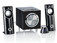 2.1 Multimedia-Soundsystem Intensiver Sound auf kleinstem Raum. Starker Bass dank Subwoofer. Ideal für PC, Notebook, Beamer, TV u.v.m. Platzsparendes, modernes Design und optimaler Klang: Mit dem 2.1-Multimedia- Soundsystem erleben Sie intensiven Sound auch auf kleinstem Raum. Der kompakte Subwoofer sorgt dabei für einen kraftvollen Bass. Sehr hilfreich: Über den praktischen Fernbedienungs-Satelliten schalten Sie die Lautsprecher ein und regulieren die Lautstärke ganz individuell. Oder Sie schließen Ihre Lieblings-Kopfhörer an - für ungestörten Hörgenuss. Aktives 2.1 Multimedia-Soundsystem: Ideal für PC, Laptop, Beamer, TV u.v.m. Fernbedienungs-Satellit mit Lautstärkeregler, Kopfhörerausgang, Mikrofoneingang und Ein/Aus-Schalter Ausgangsleistung: 16 Watt RMS (8 Watt Tieftöner, 2x 4 Watt Hochtöner), Musik- Spitzenleistung: 32 Watt Frequenzgang: 40 Hz bis 16 KHz Zusätzliche Klinke-Ausgang, z.B. für Kopfhörer Stromversorgung: 230 V (Eurostecker) Maße: Subwoofer 15,5 x 13 x 18 cm, Satelliten 18,5 x 7 x 9,5 cm Aktives 2.1 Multimedia-Soundsystem inklusive Subwoofer, 2 Satelliten-Lautsprecher, Fernbedienungs-Satellit, Signalkabel und deutscher Anleitung
